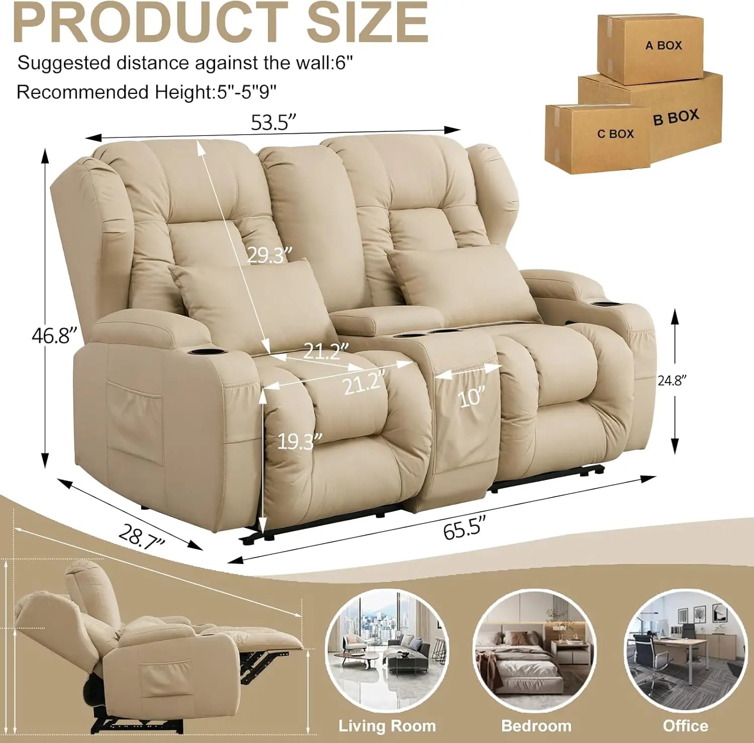65.5" RV Loveseat Recliner Double Recliner RV Sofa & Console | RV Couch | RV Furniture, Home Theater Seating… (Beige)