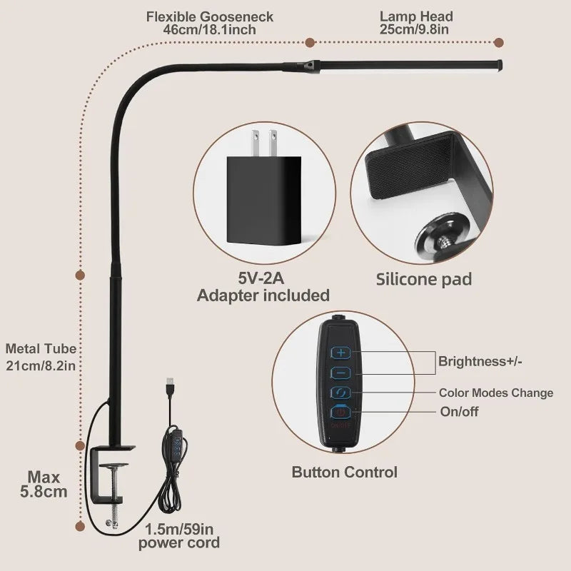 Led Desk Lamp for Home Office, Eye-Caring Desk Light with Clamp, Clip on Light for Reading, 3 Modes 10 Brightness, Flexible Goos