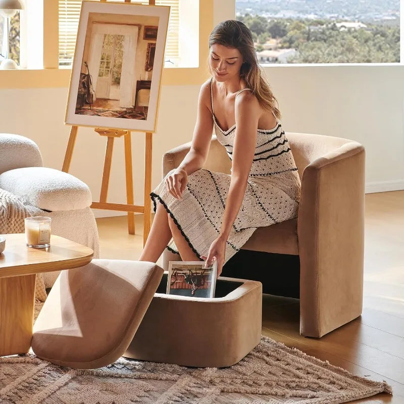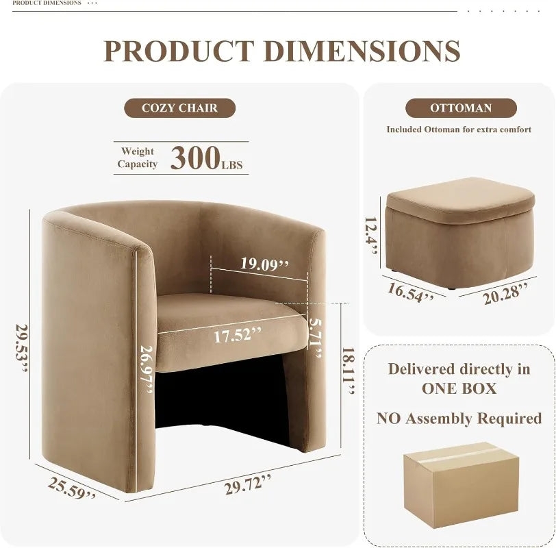 Upholstered Velvet Barrel Accent Chair with Storage Ottoman Set of 2 Morden Living Room Side Chair Single Sofa Armchair Khaki